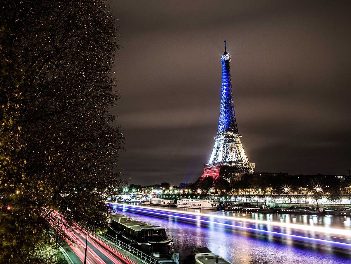 The Eiffel Tower lit in blue white red 9.02.2026