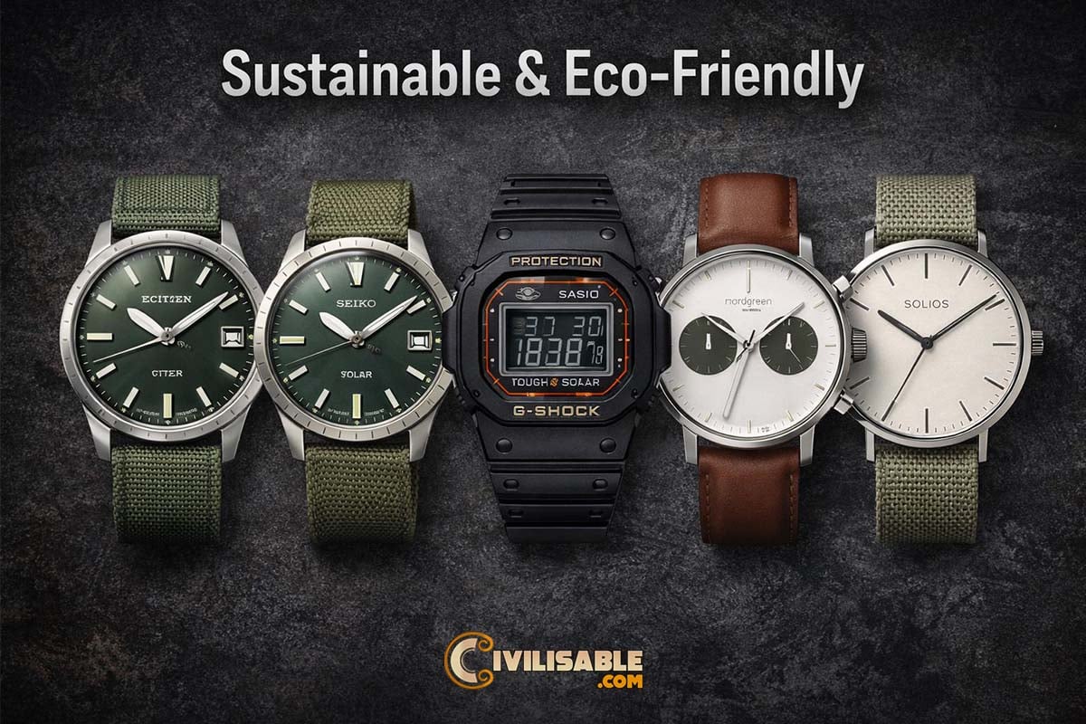 Sustainable watches emphasize responsible materials and eco‑friendly construction. This includes solar‑powered movements, recycled metals or straps made from plant‑based materials. These trend forward designs align with conscious fashion, leisure looks, and green living.