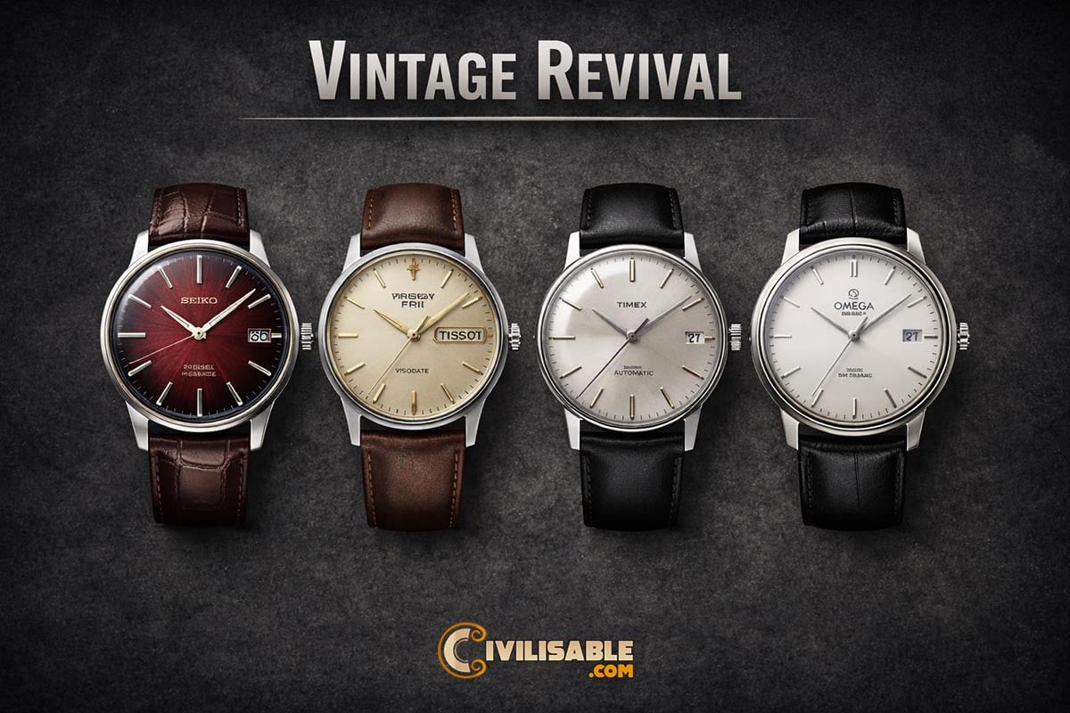 Vintage Revival watches bring back classic designs from past decades — slim cases, minimalist dials, timeless proportions, and dressy elegance. These styles suit both casual and formal looks, adding a touch of refined nostalgia to your outfit. Vintage Revival works especially well with leather jackets, tweed blazers, tailored suits, and smart casual ensembles.